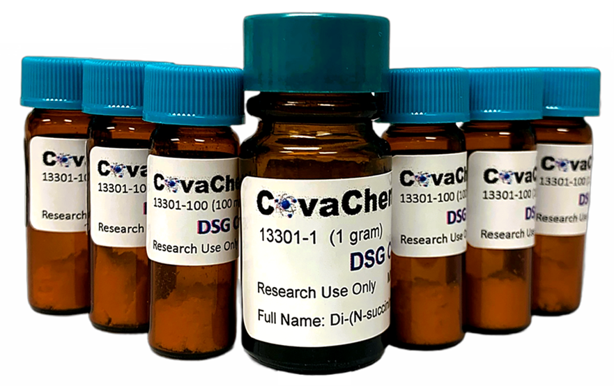 CovaChem's DSG is among the highest purity in the industry, with an absolute purity specification of ≥ 97%, measured with quantitative NMR against an internal standard, and typical batches have purity values close to 99% pure. Package Sizes: 100 mg and 1 gram Product Numbers: 13301-100 and 13301-1 Product Name: DSG Crosslinker Alternative Names: DSG, discuccinimidyl glutarate, DSG crosslinker, Succinimidyl glutarate, Di(N-succinimidyl) glutarate, 2,5-dioxopyrrolidin-1-yl 6-(2,5-dioxopyrrolidin-1-yl)-5-oxohexanoate; C13H14N2 O8