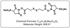 DTSSP is a cleavable protein crosslinking reagent that contains a disulfide moeity in its eight atom spacer arm. DTSSP is a membrane impermeable, homobifunctional crosslinker that is reactive towards amine (amino) functional groups. In the pH range of 7-9, this reaction is particularly selective for primary amine groups, resulting in the formation of stable amide linkages. Phosphate buffers and phosphate buffered saline are typically used for crosslinking reactions involving DTSSP, although others non-amine containing buffers may also be used. Once the reaction between DTSSP and proteins or peptides is complete, the disulfide-containing crosslinked protein can be cleaved via reduction of the crosslinkers disulfide bond using a reducing agent, such as 2-mercaptoethanol (CovaChem 11301-10x1) or DTT (CovaChem 11302-10x5). CovaChem's technical support team is readily available to assist with any individual optimization. Dithiobis(sulfosuccinimidyl propionate) (DTSSP) is the water soluble version of Lomant's Reagent (DSP). Both DSP and DTSSP have been used extensively in protein crosslinker applications as well as other scientific applications involving forming a stable linkages between the disulfide group and metal surfaces, while leaving the NHS functional groups available to react with other nucleophiles. This application can be useful for immobilizing proteins or other molecules to the surface of gold beads or other foil. Due to the lipophobic nature of the sulfonate groups on DTSSP, this crosslinker does not permeate the cell membrane. This feature makes DTSSP particularly useful for crosslinking membrane proteins on the surface of the cell without interfering with intercellular proteins. Package Sizes: 100 mg and 1 gram Product Numbers: 13304-100 and 13304-1 Product Name: DTSSP Crosslinker Alternative Names: DTSSP; 3,3'-Dithiobis(sulfosuccinimidyl propionate); Dithiobis(sulfosuccinimidyl propionate); 81069-02-5; cleavable Sulfo-NHS crosslinker; DTSSP Protein Crosslinker Specifications Appearance: White Solid Purity: is ≥ 90% Storage: 4 °C, protected from moisture Properties Properties Physical State: Solid CAS#: 81069-02-5 Chemical Formula: C14H14N2Na2O14S4 Molecular Weight: 608.51 Spacer length: 12.0 Å Additional Product Information: