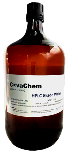 HPLC Grade Water Product Description CovaChem's HPLC Grade Water is highly refined for optimal performance in High Performance Liquid Chromatography. This product is 0.22 micron filtered, and contains a very low ultraviolet absorbance for low background signal and smooth baseline performance in HPLC applications. Package Sizes: 1 Liter, 4 Liters and 4 x 4 Liters Product Numbers: 16301-1, 16301-4, 16301-4x4