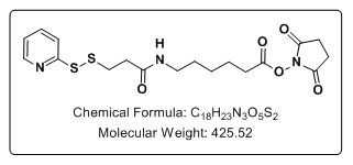 Succinimidyl 6-[3-(2-pyridyldithio)propionamido] hexanoate (LC-SPDP) is a heterobifunctional crosslinker that is amino reactive on one end and sulfhydryl reactive on the other end. LC-SPDP contains a long spacer arm (15.7 Å)for increased molecular flexibility and a reducible disulfide, which is allows for cleavage of the crosslinker after crosslink formation.
