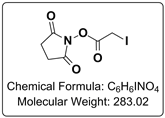 Package Sizes: 100 mg and 1 gram Product Numbers: 13408-100 and 13408-1 Product Name: SIA Crosslinker Alternative Names: SIA; Succinimidyl iodoacetate; NHS Iodoacetate; SIA NHS; 39028-27-8; C6H6NO4I; Iodoacetic acid NHS ester; amino sulfhydryl reactive crosslinker; thiol reactive crosslinker; C6H6INO