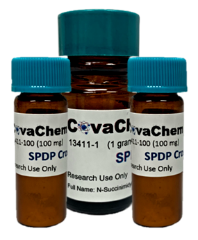 N-succinimidyl-3-(2-pyridyldithio)propionate (SPDP Crosslinker) is a cleavable heterobifunctional crosslinker. SPDP contains a dithiopyridyl group which is reactive towards cyteines (-SH groups) and an NHS group, which is useful when targetting primary amines (-NH2 groups). SPDP also contains a disulfide linkage in its spacer arm, which is cleavable with reducing agent, such as DTT, TCEP, among a few others carried by CovaChem. Package Sizes: 100 mg and 1 gram Product Numbers: 13411-100mg and 13411-1g Product Name: SPDP Crosslinker Alternative Names: SPDP; SPDP Crosslinker; 68181-17-9; N-succinimidyl-3-(2-pyridyldithio)propionate; 3-(2-Pyridyldithio)propionic acid N-hydroxysuccinimide ester; 3-(2-Pyridyldithio)propionic acid NHS ester; C12H12N2O4S2